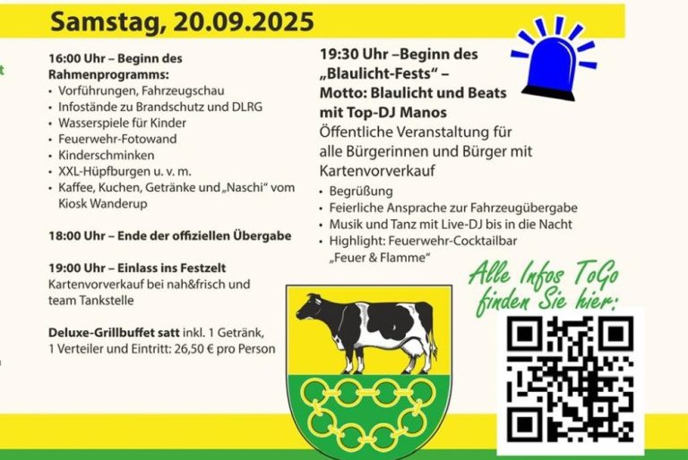 Wir feiern im Rahmen der Wanderuper Festtage "Wanderup trifft sich" unser neues Feuerwehrfahrzeug LF20. Es findet am Nachmittag die offizielle Übergabe statt, begleitet von einem bunten Rahmenprogramm für Klein und Groß. Abends heißt es dann "Blaulicht und Beats" mit DJ Manos. Alle feiern mit! Tickets für die Abendveranstaltung mit Essen und Tanz sind bei der team Tankstelle und bei Familie Thordsen nah&frisch in Wanderup erhältlich.